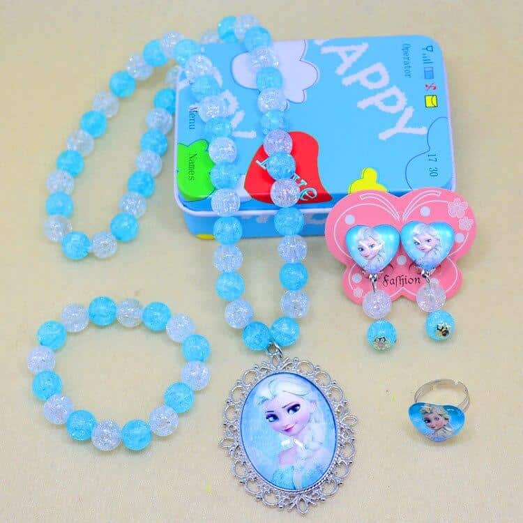 Entdecken Sie dieses schöne 5-teilige Perlenschmuckset mit dem Motiv der Eiskönigin. Ein niedliches und komplettes Schmuckstück für kleine Mädchen, die Fans des Disney-Zeichentrickfilms sind. Wenn das bei Ihnen der Fall ist, wird sie sich bestimmt in dieses Schmuckset, bestehend aus einer Halskette, einem Armband, einem Ring und einem Paar Ohrringe, verlieben. Schenken Sie es Ihrer kleinen Prinzessin als Geburtstagsgeschenk.