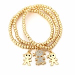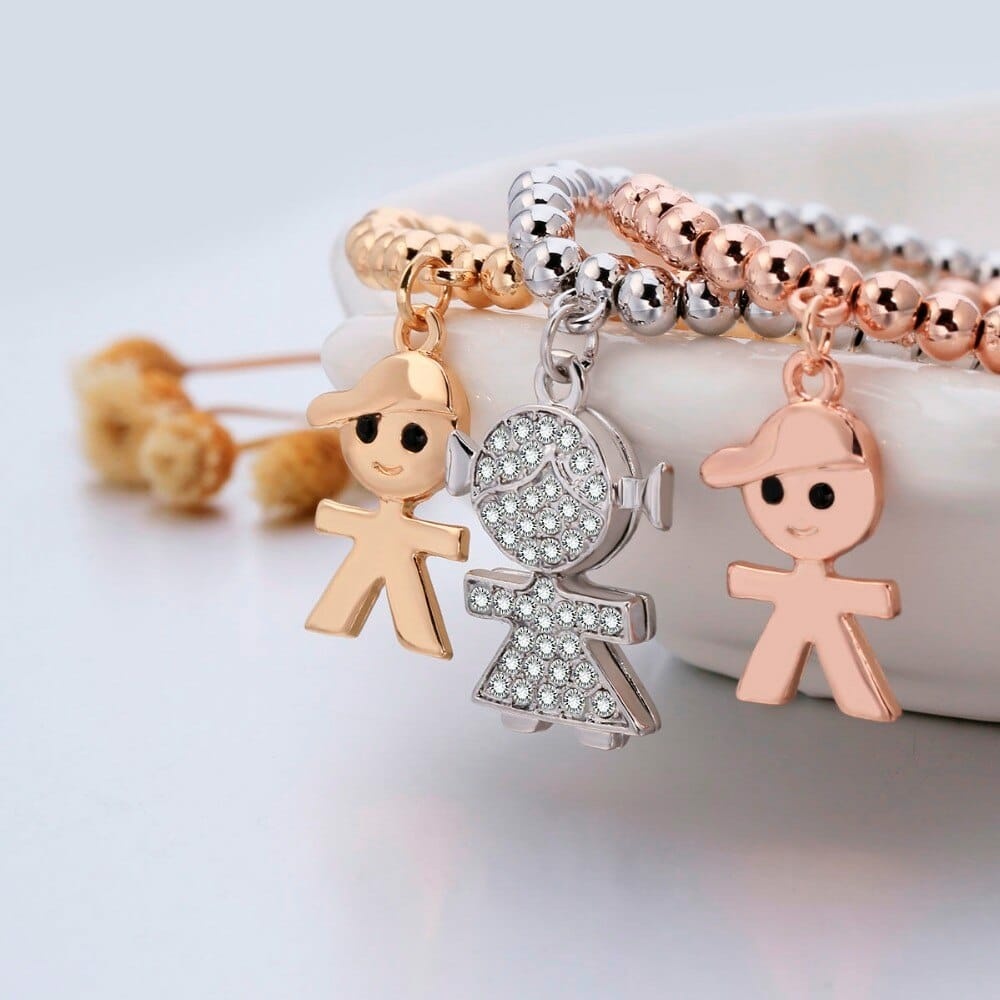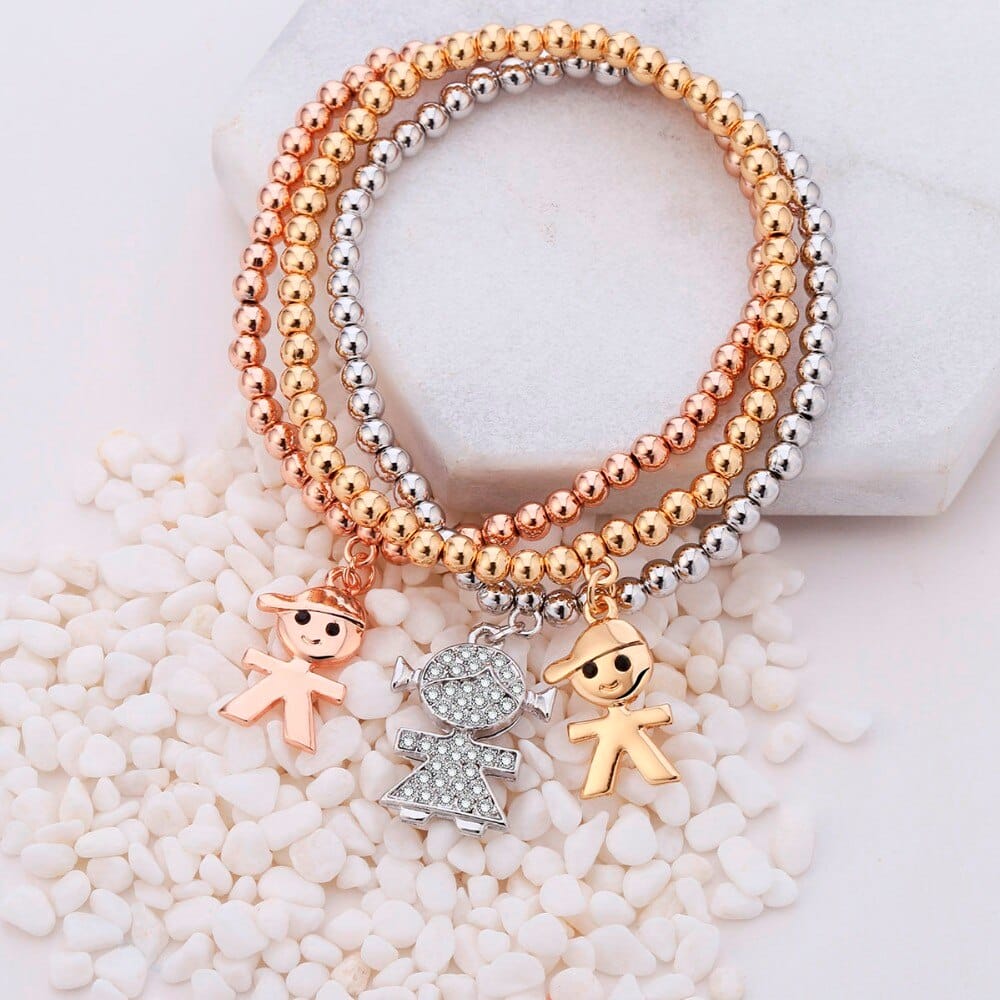 Dieses hübsche Perlenarmband mit Anhänger in Form von kleinen Mädchen oder Jungen ist ein echter Hingucker. Dieses Schmuckstück eignet sich hervorragend als Geschenk für Kinder. Es ist in verschiedenen Farben erhältlich und eignet sich sowohl für Mädchen als auch für Jungen. Dieses dreiteilige Armband wird das Handgelenk Ihres Kindes verschönern.