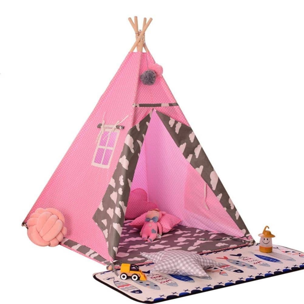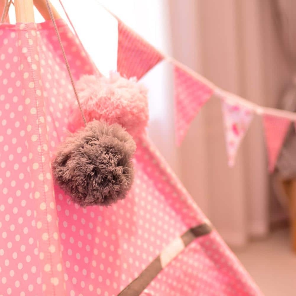 Dieses Tipi aus weißem und rosa Stoff mit kleinen Punkten ist ideal für das Kinderzimmer. Das Tipi besteht aus 4 Holzpfosten und einem Stoff aus 100% natürlicher Baumwolle. Es lässt sich mit den 2 mitgelieferten Schnüren leicht auf- und abbauen.