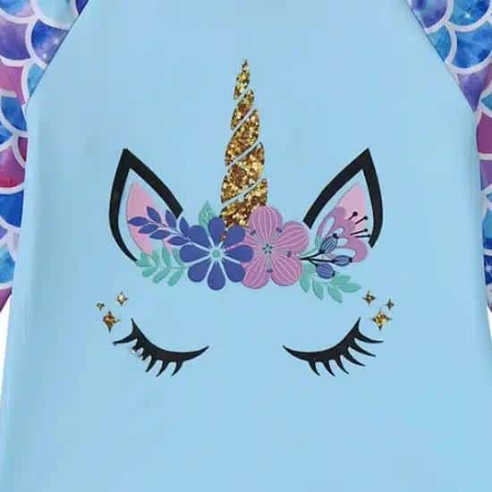 Dieser zweiteilige Badeanzug für Mädchen ist perfekt für sonnige Sommertage. Er besteht aus einem Oberteil mit langen Ärmeln und einem Unterteil, das eine vollständige Bedeckung bietet. Das Oberteil ist mit einem Rundhalsausschnitt versehen, der für zusätzlichen Komfort und Schutz sorgt.