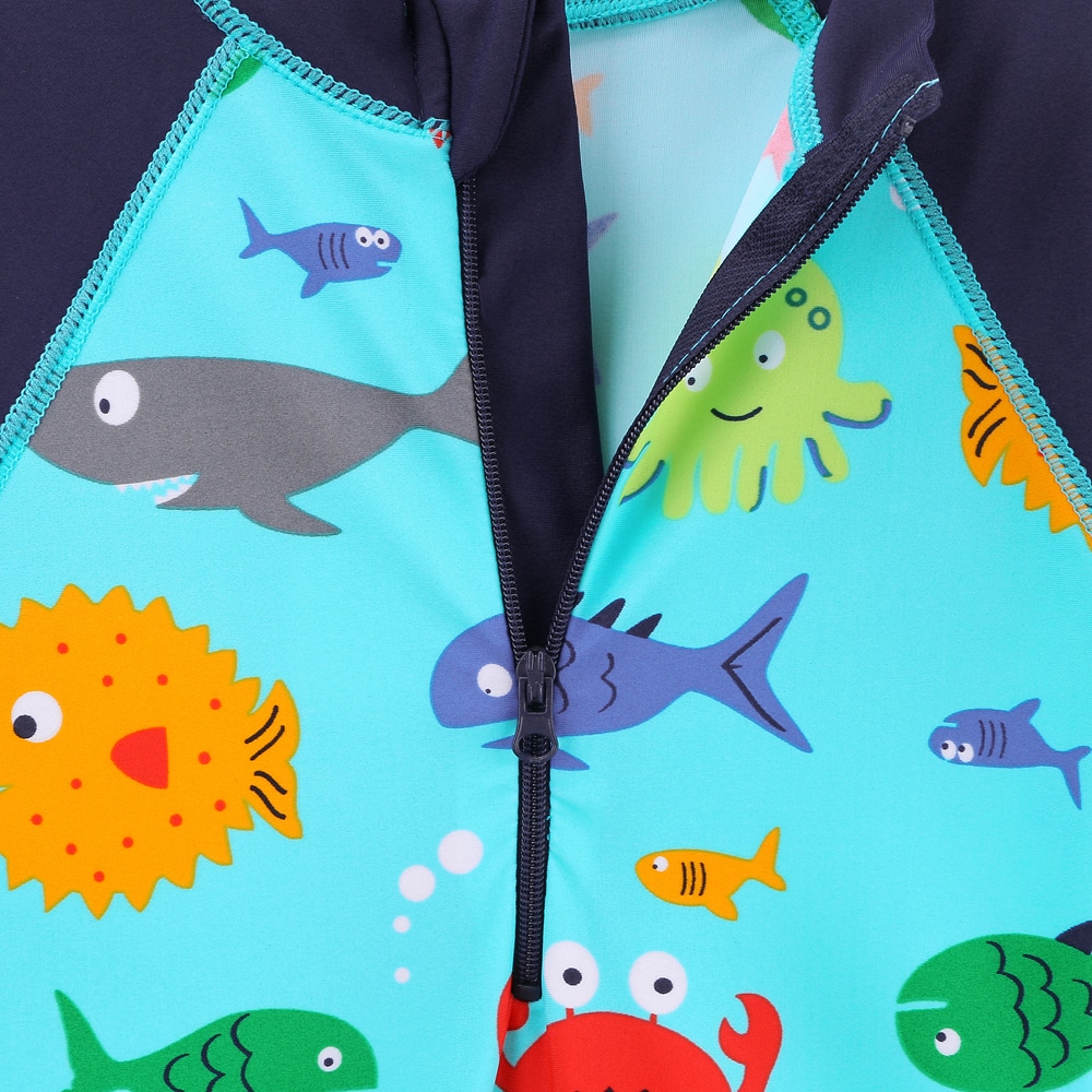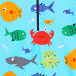 Der Badeanzug für Jungen in Blau mit Meerestieren ist in verschiedenen Größen erhältlich, um allen Körperformen gerecht zu werden.
