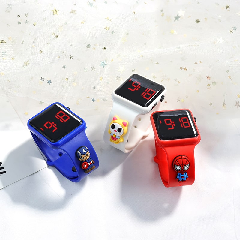 Quadratische, farbenfrohe Kinderuhr mit einer kleinen Figur auf dem Armband